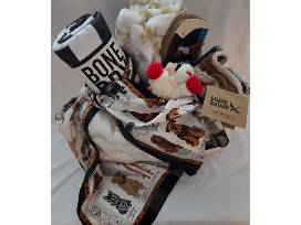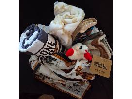 A cozy collection designed for pampered pups. This bundle includes a plush cream-colored puffy carrier, an Eddie Bauer sherpa vest in size small, and a soft 30x60 cream blanket patterned with tan paw prints. Also tucked inside is a bag of Trader Joe's Chicken & Bone Broth Recipe treats and a cuddly toy, making it the perfect gift for a small dog who loves style, comfort, and a few tasty rewards.