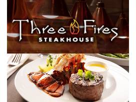 - $50 off Dinner in the Three Fires Steakhouse & Bar, which offers an incredible selection of steaks, chops, seafood, pasta, and desserts.