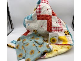 This basket is for a little Sunflower Baby. It would make a darling baby shower or welcome baby gift! Inside the wicker basket you'll find: