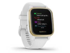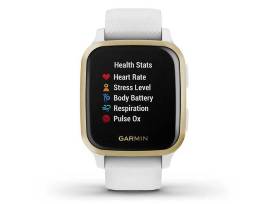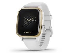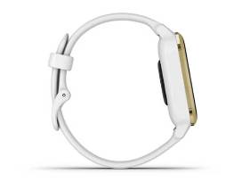 The Garmin Venu Sq GPS Smartwatch - White/Light Gold - features a bright color display and combines daily style with health monitoring and fitness features that inspire you to keep moving.