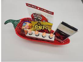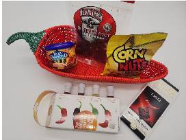This basket is chocked full of your favorite hot and spicy snacks that will look amazing when you serve them along with chips and salsa in the accompanied serving dish and fantastic red pepper shaped basket.