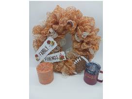 A highlight of this beautiful fall wicker basket with wooden handles is an 18" x 18" gauze wreath in sparkling fall colors embellished with two wooden signs decorated in fall motifs welcoming "Family" and "Friends". A sparkly football adds a familiar fall touch to this beautiful wreath enhancing the front door of any home.