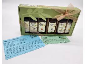 This ribbon-wrapped gift box is filled with six extraordinary extra virgin olive oils and balsamic vinegars from The Tasteful Olive, our local source for these wonderful products. Create harmonious and flavorful salad dressings, dipping sauces, marinades and dishes to delight any palate. Included are 60 ml. bottles of the following: