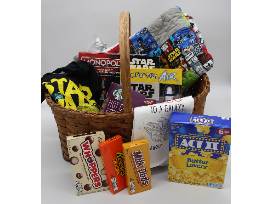 This beautiful wicker handled basket (20" x 15.5") is loaded to the brim with Star Wars items to fill your Star Wars-themed game night, including:
