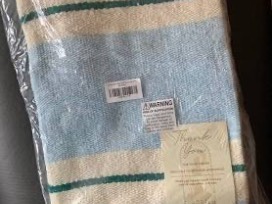 A Sundream Coffee Drift Throw-Shoreline-Blue and white woven with blue/green accent stripe-tassels on each end-Both beautiful and sustainable, these blankets are made of reclaimed fibers derived from 100% post-consumer materials containing a special blend of cotton, acrylic, and polyester. This throw is designed to be be your go-to blanket.