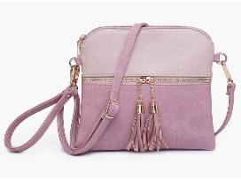 Tara is one of the most popular Jen & Co. styles with its double tassel zippers! This crossbody bag ink pink & mauve features a removable/ adjustable shoulder strap, rose gold-tone hardware, and a zipper top closure. It also has plenty of pockets! Made of vegan leather. Dimensions: 9.5"L x 0.5"D x 9"H.