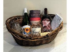 This package includes a gift certificate for a private wine tasting party for six with the Somerset Ridge owners, which includes a beautiful charcuterie plate. The winning bidder also receives this beautiful gift basket filled with a pair of stemless wine glasses, cocktail napkins, Manchego Wine Chips, chocolates, a candle, and bottles of two popular Somerset Ridge wines: