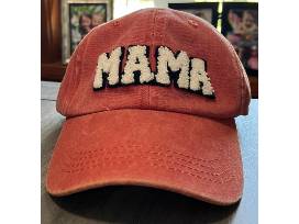 - "Mama" Ballcap in rust with black trimmed white fur lettering and adjustable strap closure