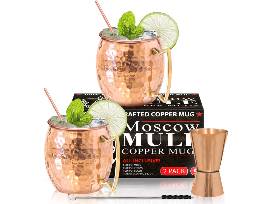 - Moscow Mule Copper Mugs Set from Benicci Inc., which includes 2 copper mugs, 2 copper straws, 1 copper jigger and 1 straw cleaning brush