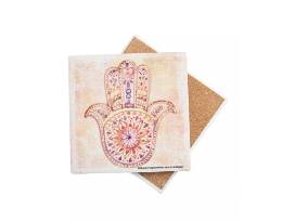 - Set of four absorbent Thirstystone coasters featuring Hamsa art that keeps tabletops and other surfaces safe from spills or stains; it also includes a metal coaster holder is lends a minimalist vibe to any room and compliments any decor theme.