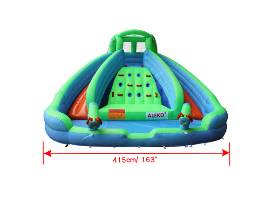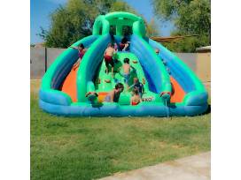This bouncer features two colorful water slides with protective side walls, a splash pool, a climbing wall, a raised rest area, water guns and 30 play balls. Each slide includes a spray hood that keeps the slide's surface slippery. For quieter moments, the raised rest area provides a wonderful place to sit while enjoying the cool water. The extra thick 420D, 6P-free, eco-friendly Oxford fabric with PVC coating is water resistant and features heavy stitching, making this suitable for regular outdoor use. This material is also puncture-proof and heavy-duty enough to support vigorous and long-lasting play.