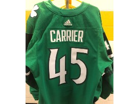 St. Patrick's Day jersey autographed by #45 Alexandre Carrier. (fight strap included). Worn during pre-game skate March 16. SIZE 56.