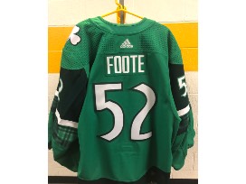St. Patrick's Day jersey autographed by #52 Cal Foote. (fight strap included). Worn during pre-game skate March 16. SIZE 58.