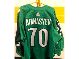 St. Patrick's Day jersey autographed by #70 Egor Afanasyev. (fight strap included). Worn during pre-game skate March 16. SIZE 58