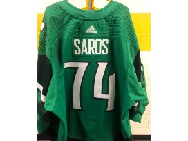 St. Patrick's Day jersey autographed by #74 Juuse Saros. (fight strap included). Worn during pre-game skate March 16. SIZE 58G.