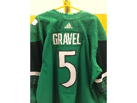 St. Patrick's Day jersey autographed by #5 Kevin Gravel (fight strap included). Worn during pre-game skate March 16. SIZE 58.