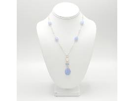 Immerse yourself in the tranquil beauty of a sterling silver necklace, adorned with blue lace agate and blue chalcedony. The necklace showcases a unique combination of these two serene stones, renowned for their soothing color palette and mystical properties.