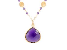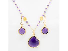 A stunning jewelry set featuring a purple amethyst pendant and beaded necklace set in 14K gold fill. With the matching purple amethyst pendant earrings, also set in 14K gold fill, everyone will be asking you where you found these gorgeous pieces.