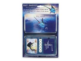 These River's Edge Products cards and dice are an amazing pair and a must have for any game night. Includes 2 decks of casino quality playing cards and 5 dice, in an attractive felt lined gift tin with embossed lid. Attractively packaged in a full color clam pack. These playing cards feature the designs of renowned artist and conservationist Guy Harvey, each 56 card deck has a unique, corresponding Guy Harvey image for each card of the suit. Help Us Support Marine Wildlife. A portion of your purchase goes to the Guy Harvey Ocean Foundation to support marine wildlife and ocean conservation efforts around the globe.