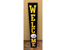 Greet your guests with these beautifully made signs, handcrafted by North Catholic Math Teacher Gaby De Jesus. The first one is "Welcome to our Home" while the second one is doubled sided. Side one features a Pittsburgh Steelers logo and the other side features a Pittsburgh Penguins logo.