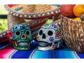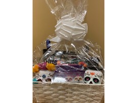 "El Día de los Muertos" or The Day of the Dead is a Mexican holiday where families welcome back the souls of their deceased relatives for a brief reunion that includes food, drink and celebration. This basket has an assortment of kitchen towels, candles, decorations, a set of wine glasses, a bottle of wine, a bottle of tequila and more.