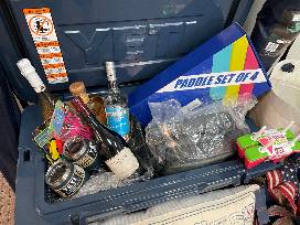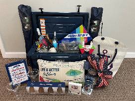 Yeti 65 Tundra Haul Cooler filled all things summer! Package includes a holiday bow, tote bag, 2 decorative signs, can cooler, decorative pillow, 4 stemless plastic wine glasses, 2 margarita glasses, 2 Dicks Sporting Goods bag chairs, paddle set for 4, mesh cooler, popsicle containers, cocktail picks, Maracame Tequila, Meiomi Pinot Noir, Cruzan Coconut Rum, moscato wine, 2 Yeti 10 oz wine ramblers. Corn Dog Baseball tickets and a long sleeve dry fit shirt.
