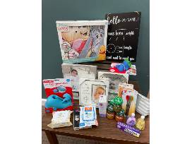 The basket includes a Disney Honey Pot play mat, three photo frames, a Moby bath cover, bath toys, 2 sets of baby spoons, assorted jars of organic baby food, gripe water, travel essential pack with Destin, hand/face wipes, body wash and lotion, decorative chalk sign for baby photos and pacifier wipes.