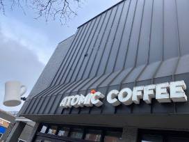 - $50 gift card, two mugs, and a bag of coffee from Atomic Coffee. Atomic Coffee is an independent shop preparing handcrafted coffee, raw juices, fresh smoothies, and made-to-order food.