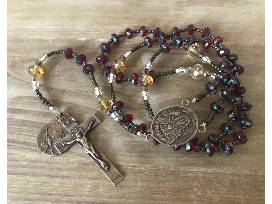 This rosary is custom made for Holy Trinity church. This rosary is made with solid bronze reproduction parts and Czech glass beads. The antique crucifix pairs well with the Seven Sorrows center. The center pairs well with the Seven Sorrows stained glass windows in the church. Also this rosary has a beautiful detailed Holy Trinity medal. The reverse side is the Holy Spirit that matches the Holy Spirit mural in the Sanctuary of the church.