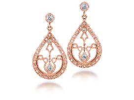 Diamond pear shape filigree dangle earrings in 18k rose gold, designed by Scott Mikolay, combining vintage glamour with a timeless silhouette.