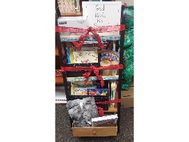 This book shelf includes a beautiful shelf with baskets full of classic children's books, a cozy blanket, 2 candles, an eye massager, and a very special, one-of-a-kind book God Made Me Special written by Mrs. Pompeii and Mrs. Frank's Kindergarten classes.