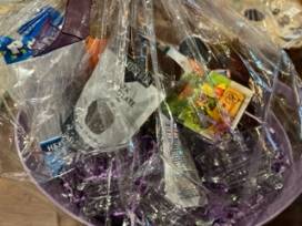 4 glass ice cream dishes, spoons, scoop, napkins, 3 kinds of sprinkles, syrup, caramel sauce and a $10 Wegmans gift card to buy the ice cream.
