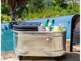 Get outdoor ready with everything you need starting with this 80-quart galvanized steel portable cooler with large handles, cup holders, an elevated base and a drainage plug. Double lid for easy access, a bottle opener, molded cup holder for drinks and holds up to 110 cans!