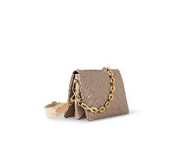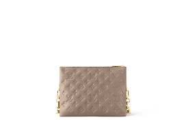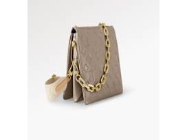 The HOT BAG! Exclusive Louis Vuitton Couissin PM in gorgeous taupe and monogram embossed puffy lambskin. Accessorized with a chunky gold-color chain, LV cross body strap & beautiful navy interior. The Couissin can be worn cross-body with the strap, as a chain baguette, or carried under the arm. 10.2 x 7.9 x 4.7 inches.