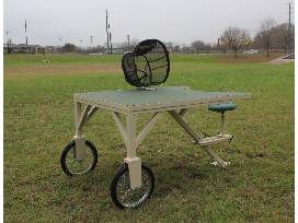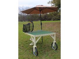E. Mobile shooting table that is sturdy enough to withstand the elements. It can be left in the pasture or kept under cover, and be stable on any terrain. Any shooter can benefit from the fully adjustable seat, allowing anyone to set the seat to their preferred shooting position. Shoot in the shade with a tilting, removable umbrella. The tabletop features a non-slip surface to reduce gun rest movements during firing. No-flat tires keep the table able to roll easily on smooth or rough terrain.