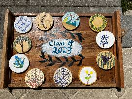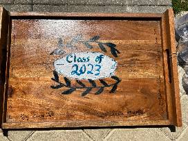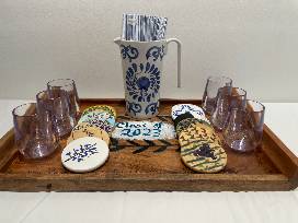 Courtesy of the RAA 8th graders, this beverage bundle makes a wonderful memento from this very special class. Each 8th grader designed and handpainted a wooden coaster and signed the solid wood serving board. You'll be ready for lemonade on the patio with a lovely pitcher and a set of 6 non-shatter tumblers.