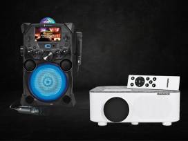 Singing Machine Fiesta Voice Portable Karaoke System Included in the box: -Fiesta Voice HD Karaoke System Model SDL9040 -1 wired Mic-Remote control -1 wired microphone -1 8GB Singing Machine Flash Drive -AC adapter Features: -6 Fun Voice-changing Effects -Plays Colorful Hi-Def Karaoke Music Videos from USB -Built-in Long Lasting Rechargeable Battery -Bluetooth for Wireless Digital Audio Streaming