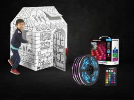 48"H X 32"W X 32"D. For kids who love to use their imaginations, this fun playhouse offers hours of creativity. Color-in the walls with markers to customize your playhouse. Features operable door and window. For kids 3 years and up. Strong corrugated construction-not cardboard. Easy 2-piece assembly.
