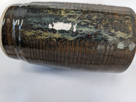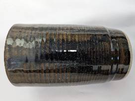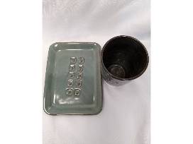 Whatever you need to hold, these will get the job done with style!. The mostly brown vase can even do double duty as a tumbler. Size: 5.25 inches tall with a 3 inch diameter. The rich variations of the glaze add to its intrigue. The small muted green platter with brown indented design, size 8 inch by 6 inch, is multi-functional and handsome to display. Indulge your creative spirit with these items made by Potters Place artisans. Potters Place is a favorite Grow group outing, where participants have fun making hand-built pottery!