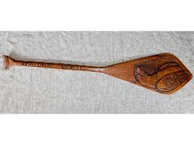 The paddle measures 46" tall x 10" at its widest part, and is made of solid wood. Dated 1997, signed by artist, Aday Pen`a.