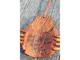 Horseshoe Crab measures 25" Tall and 16" wide and includes hardware for hanging, or the piece may be displayed on a table.