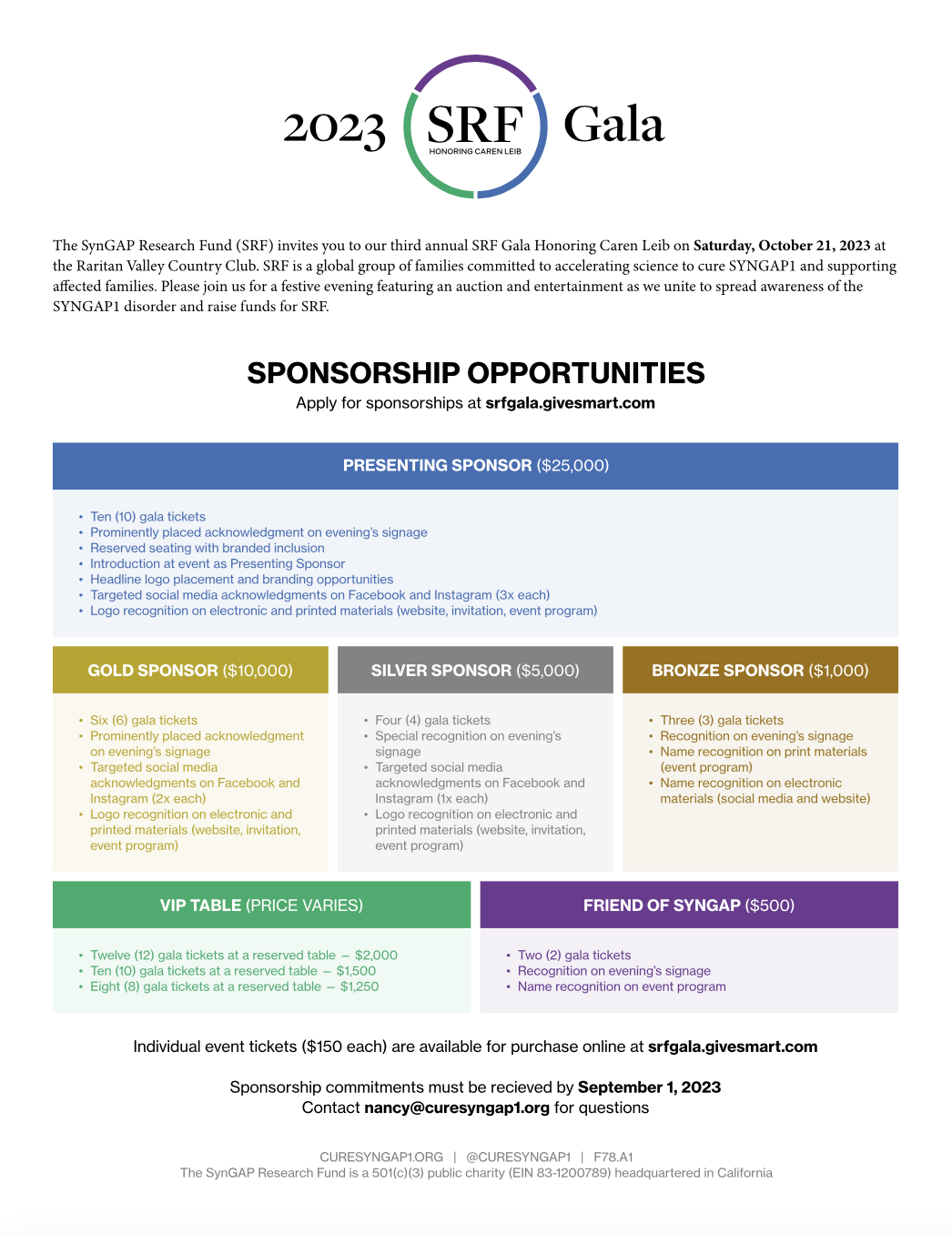 We are excited to host this year's gala which will be a festive evening of socializing, dining, live entertainment, and fundraising. We are truly thankful for all of our friends, old and new, who share our passion to improve the lives of individuals living with the rare neurological disorder known as SYNGAP1. See you in October!
