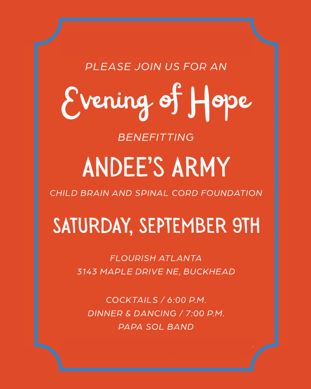 We are excited to chair Evening of Hope, Saturday, September 9th, 2023, supporting Andee's Army. Proceeds from this important - and fun - event will support SPINE, BRAIN and Brain Buddies, Andee's Army initiatives at Children's Healthcare of Atlanta. Our honoree this year is Anna-Lisa Tarabicos, Nurse Practitioner and Manager of APP for Physiatry at Children's Healthcare of Atlanta.