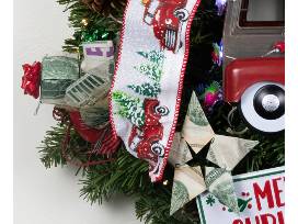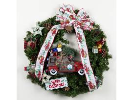 Included--Battery-operated 30", lighted wreath with decorations and gifts: