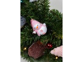 - Assorted yarn trees and carpet sample ornaments, snowmen, and fuzzy white ribbon