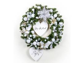 Included--Battery-operated, lighted 30" wreath with decorations and gift cards to: