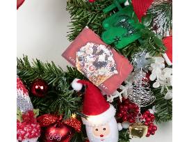Included--Battery-operated, lighted 30" wreath with decorations and gifts: