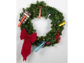Included--Battery-operated, lighted 30" wreath with decorations and gift card to: