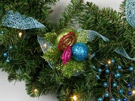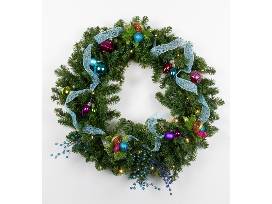 Included--Battery-operated, lighted 30" wreath with decorations and gifts: