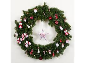 Included--Battery-operated, lighted 30" wreath with decorations and gift card: